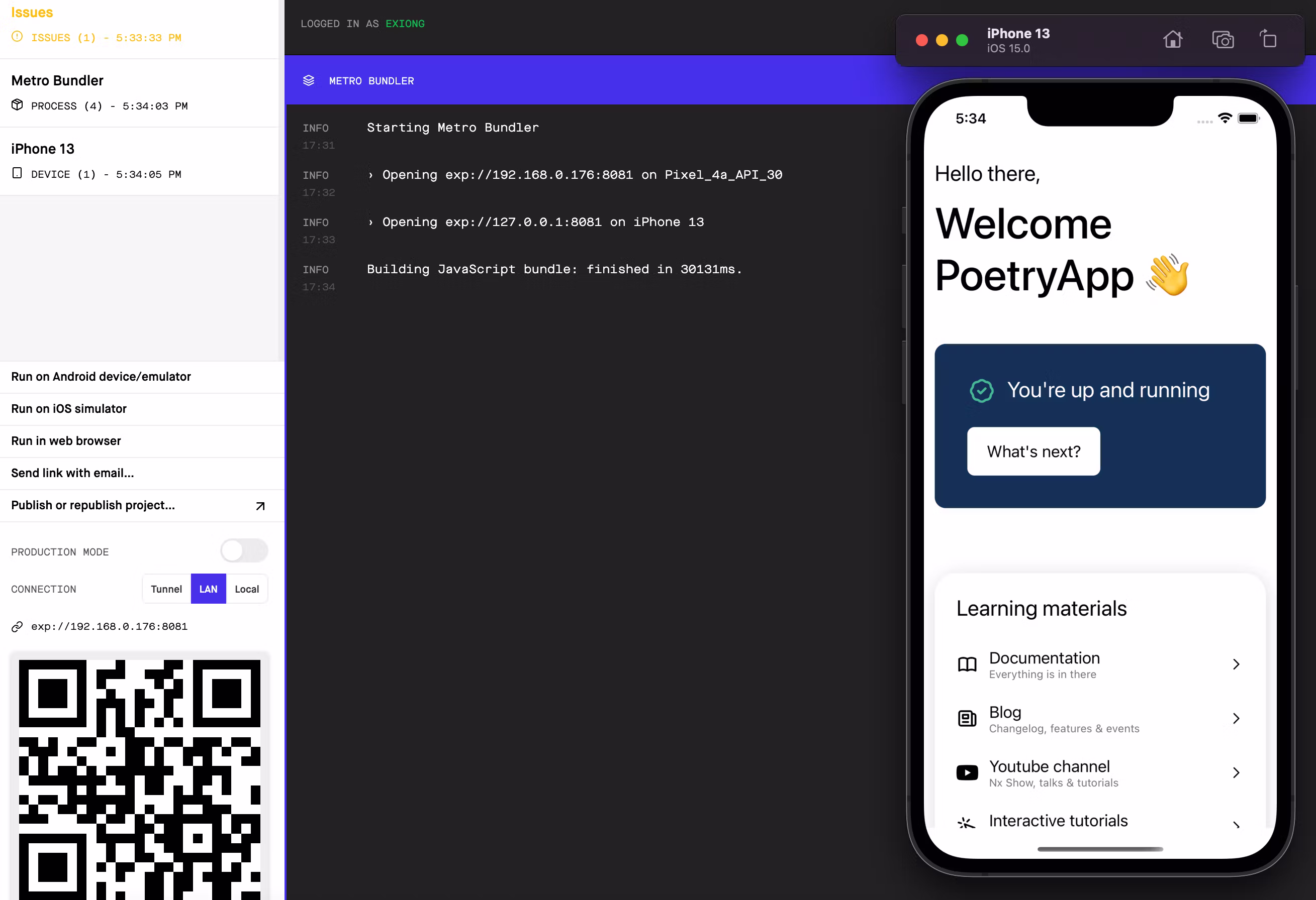Now run the command to serve up the Expo Development Server: