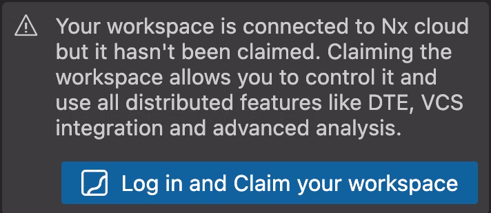 If you've just started using Nx Cloud, you will probably see this message prompting you to claim your workspace: